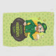 Golf Towel with an Illustration of a smiling leprechaun wearing a green suit, a bow-tie, and a bowler hat while sitting inside a pot o’ gold and holding a pint of beer, with yellow, green, and orange rainbow in the background. The image is placed over a seamless light green background with shamrocks.