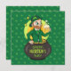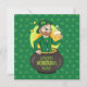 Cartoon leprechaun in a pot of gold holding a pint invitation