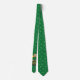 Tie twith an Illustration of a smiling leprechaun wearing a green suit, a bow-tie, and a bowler hat while sitting inside a pot o’ gold and holding a pint of beer, with yellow, green, and orange rainbow in the background. The image is placed over a seamless dark green background with shamrocks.