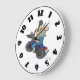 This design is a cartoon man on a motorcycle. The man is riding off looking behind him. He has a red love heart tattoo on his arm. This cartoon man on a motorcycle design looks great on this Clock