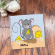 A cute notebook with a grey little mouse eating some delicious Swiss cheese . Designed for young children . It is ideal for homeschooled kids . Can be used for practicing handwriting and drawing . You can choose the type of paper to fit your needs . Personalise it with the child's name .