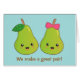 A cute cartoon of a pair of pears, the male one with the leaf and the female one with a bow at the stem. The caption reads "We make a great pair!" while the inside message reads "xoxo!" A humourous word play on the word pear with pair. This kawaii design is suitable for couples that are newly in romance as it is subtle. Design by Rusty Doodle.