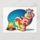 A fun and colourful cartoon piglet roasting by a fire, by the Wizard of Draws, that will brighten your day!
