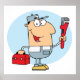 Cartoon Plumber Holding Pipe Wrench and Toolbox Poster