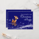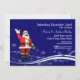 Funny looking cartoon Reindeer on the front and Santa Claus on the back on a blue snowy background. Very cute and fun Christmas party invitation.