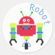 Birthday party favour sticker with colourful cartoon graphics of a red, green, yellow, and blue robot. Dotted blue text reads Robot and can be personalised. Matching party supplies are available.