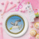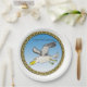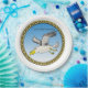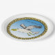 Cartoon seagull flying over head with a gold frame paper plate