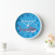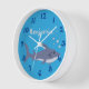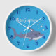 A cute blue wall clock with a swimming great white shark . Ideal for a nursery room , a child's room , a playroom , a kid library or a preschool classroom . Can be personalised with a name .