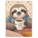 Cartoon sloth with exaggerated sleepy eyes with quote "slow down sip"