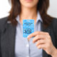 This name or identification badge is a mix of shades of vibrant blues with a cartoon smiling snail with white eyes and a black outlined blue patterned shell. Customise your name and information with the templates.