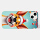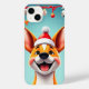 Cartoon-style dog with an expressive, joyful face. The dog is sitting in a festive setting, wearing a red Santa hat adorned with a fluffy white pom-pom. Its fur is predominantly orange with white accents, adding to its cheerful appearance.
