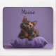 Cartoon Tortoiseshell Kitten on Purple Cushion Mouse Pad