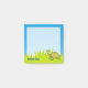 Cartoon illustration of a happy turtle on grass and sky background. Custom text.