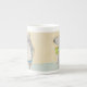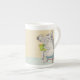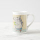 Cartoon warthog sitting daintily on a small blue cushioned stool. She is staring wistfully into the distance. In her "hand" is a beautiful light green cup and saucer. The cup is accented by a dark green handle with tangerine orange on the inside of the cup.