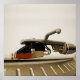 A 12-inch LP being played. The stylus is in contact with the surface by wikipedia: A phonographic record (also known as a gramophone record, especially in British English), often simply recorded, is a storage medium for analogue sound in the form of a flat disc with an inscribed modulated spiral groove. The groove usually starts near the periphery and ends near the centre of the disc. Initially, the discs were commonly made of shellac; starting in the 1940s, polyvinyl chloride became common. Since