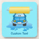 Smiling blue cartoon car washing under carwash brush. Custom text.