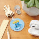 Smiling blue cartoon car washing under carwash brush. Custom background colour. Custom text on both sides.