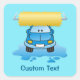 Smiling blue cartoon car washing under carwash brush. Custom background colour. Custom text.
