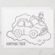 Colouring book page. Cartoon of a man in working form, hand washing a car. Custom text.