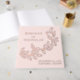 This Elegant Cascading Blush Pink and Rose Gold Foil guest book adds a stylish, personalised touch to your wedding ceremony. The design features your names, wedding date, and location in rose gold foil lettering divided by a vine of sketched leaves with a blush pink background. Add custom text to the spine such as your names, wedding date, etc. The back of the gold foil botanical guest book displays your square engagement photo.