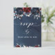 A navy blue and burgundy watercolor floral wedding invitation RSVP enclosure card featuring a watercolor painted navy blue background with navy and burgundy peonies and dusty blue eucalyptus greenery.