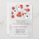 Fun holiday invitation with a casino theme. Design features four aces, dice and poker chips on grey and white snowflake background.