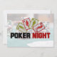 A poker party / casino night party invitation. The front has a faint background with a photo of poker chips and layered over top are 4 playing cards with a sexy girl silhouette and Poker Night typography. The back has your party details layered over top a faint image of some playing card and poker chips on a gaming table.