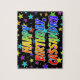 This exciting, vibrant, birthday-themed jigsaw puzzle design has the message "HAPPY BIRTHDAY, CASSANDRA" with the characters having a colourful rainbow spectrum inspired gradient pattern, in addition to a fun stars background pattern. A colourful puzzle like this might be a fun way to send birthday greetings to somebody named Cassandra. [~Z0000468]