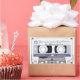 The "Cassette Tape" design features a typical vintage music cassette tape, with a transparent case and colourful stickers and writing, It also has customisable text which you can personalise.