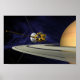 This is an artists concept of Cassini during the Saturn Orbit Insertion (SOI) manoeuvre, just after the main engine has begun firing. The spacecraft is moving out of the plane of the page and to the right (firing to reduce its spacecraft velocity with respect to Saturn) and has just crossed the ring plane. The SOI manoeuvre, which is approximately 90 minutes long, will allow Cassini to be captured by Saturn's gravity into a five-month orbit. Cassini's close proximity to the planet after the manoeuvre offers a unique opportunity to observe Saturn and its rings at extremely high resolution. Use the poster at home, work, or the classroom.