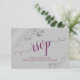 These beautiful RSVP cards will make it easy for your guests to respond to your wedding invitation. They feature an elegant design with cassis purple or magenta coloured script calligraphy on a grey background, and lacy silver grey faux foil curls and swirls in the corners. The back of the card is a form for your guests to fill out and return indicating if they can attend or not, the number of guests they're bringing, and their choice of meals. There is also space for a website so your guests can respond online if it's more convenient for them.