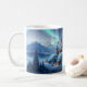 Coffee mug of an impressive castle made of igloos and stone, in a winter landscape of snow and pine trees. Magical aurora lights play in the evenfall sky, bathing the mountains and valley in a surreal atmosphere of heavenly colors. Amidst the misty strands of cold and snow, the stronghold castle known as "Winter Fire" stands. It is the last bastion of civilization and warmth before a vast expanse of frozen tundras, snowcapped mountains, and haunted forests open themselves to the wanderlust of the willing traveler... This artwork was created with ImageFX and upscaled with Leonardo.ai. Additional editing was done offline by me.