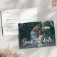 A modern save the date postcard designed to accommodate your favorite horizontal or landscape oriented full-bleed engagement photo. "Save the date" appears near the bottom of your photo in a fresh, casual handwritten brush marker typography style. Personalize with your names, wedding date and wedding location beneath.
