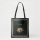 The white petals of a blooming daisy make a striking appearance on this black tote bag. Your name appears in casual feminine typography above the flower. Two square outlines in light yellow create an attractive accent on the edges of the bag. The same floral photography design appears on both sides. This botanical design also looks great on larger tote bags.