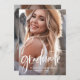 This trendy, elegant grad party invitation features two photos of the graduate. On the front there is casual modern white script along with the grad's name, school, and class year. On the back is a second, faded, photo of the graduate with all of your party information clearly printed over it on an overlay. A stylish and simple graduation invitation that will highlight your grad's favourite personal photos!