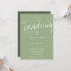 A wedding invitation with a casual, yet modern, typography design and minimalist leaf details. This sage and darker green solid colour invitation accents the big event with the word Wedding in a large, handwriting-style, font. The rest of the invitation is in open typography that gives the design a strong structure. This invitation reflects the relaxed, yet well-organised, nature of your wedding. Ready to check invitations off your list? Simply add your information, add this invite to your cart, and have a great wedding.