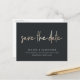 A modern save the date postcard with "save the date" in faux gold foil handwritten lettering on a rich, soft black background. Personalize with your names, wedding date and wedding location beneath in white lettering.