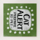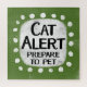 An irreverent and cute typographic animal design that says "Cat Alert, Prepare To Pet". It features black and red text on a white rectangle with funky, playful white dots surrounding it, all on a grey background.