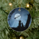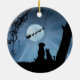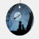 Cutest ornament of a dog and cat under an oak tree watching as Santa and sleigh with reindeer fly by on Christmas eve. A fun and whimsical holiday ornament.