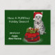 Adorable cat and mouse for the holidays! Kitty wears a Santa hat with a mouse in his mouth as a gift for the holidays, while a little white mouse escapes the Santa sack marked 'Mice'.
