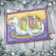 This cute Holiday card features a vintage art image of a grey and white, sleeping cat on a brightly coloured rug. Hung from the cat's back with striped candy cones are three patterned Christmas stockings, each with a very surprised mouse peeking out. Is this reality, or just the cat's dream for Christmas? This delightful image is framed in decorative purple and gold. The inside text is fully customisable, so you may make it say whatever you'd like. Unique, colourful, and fun!