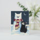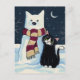 Cute cat postcard for the festive season featuring a reproduction of an original painting by Lisa Marie Robinson. A black and white cat sits beside a familiarly shaped snow figure in the dead of night. Copyright © Lisa Marie Robinson. All Rights Reserved.