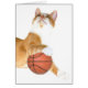 Orange and white tabby cat holds on to the basketball while he looks up at the basket photo greeting card