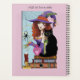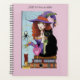 A cute red haired witch all in purple with her black cat sitting on a pile of books, Potions, spider and candle in a backdrop of pink.