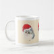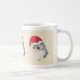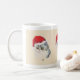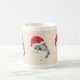 Cat Christmas, a cute illustration featuring a persian cat wearing Santa's hat. Main colours: beige, white, red, grey, black and yellow. The original drawing was made with coloured pencils by artist © E. D. Siffert.