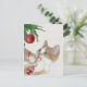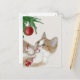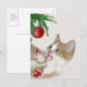 Orange and white tabby cat plays with Christmas ribbon and eyes the ornament on the Christmas tree indulging in Christmas fun and play photo Christmas postcard