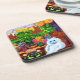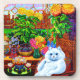 Coasters featuring Louis Wain’s animal painting Master of Cat College (1860-1939). A thoughtful white cat with striking blue eyes sits ponderously next to a vibrant assortment of beautiful flowers. The majestic cat college looms in the background underneath a pink and blue sky. A wonderful gift for cat lovers and English art.