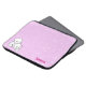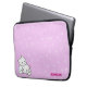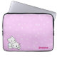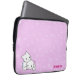 A laptop sleeve with a fun pattern and a cute cartoon cat couple. It has a pink background with white swirls. In the left corner it has a boy and girl cartoon kitten snuggling. In the right corner you can customise your name.