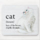 A dictionary definition for CAT in black text on a whitewashed wood background with a white Persian cat sketch