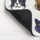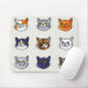 Drawings of cats’ heads of nine different breeds (ginger, white, black, orange and white, tuxedo, pointed/ragdoll/Siamese/colorpoint/Birmese, Russian blue/grey/gray/silver, tortoiseshell, and grey/gray/silver tabby), printed on off-white mousepad.
